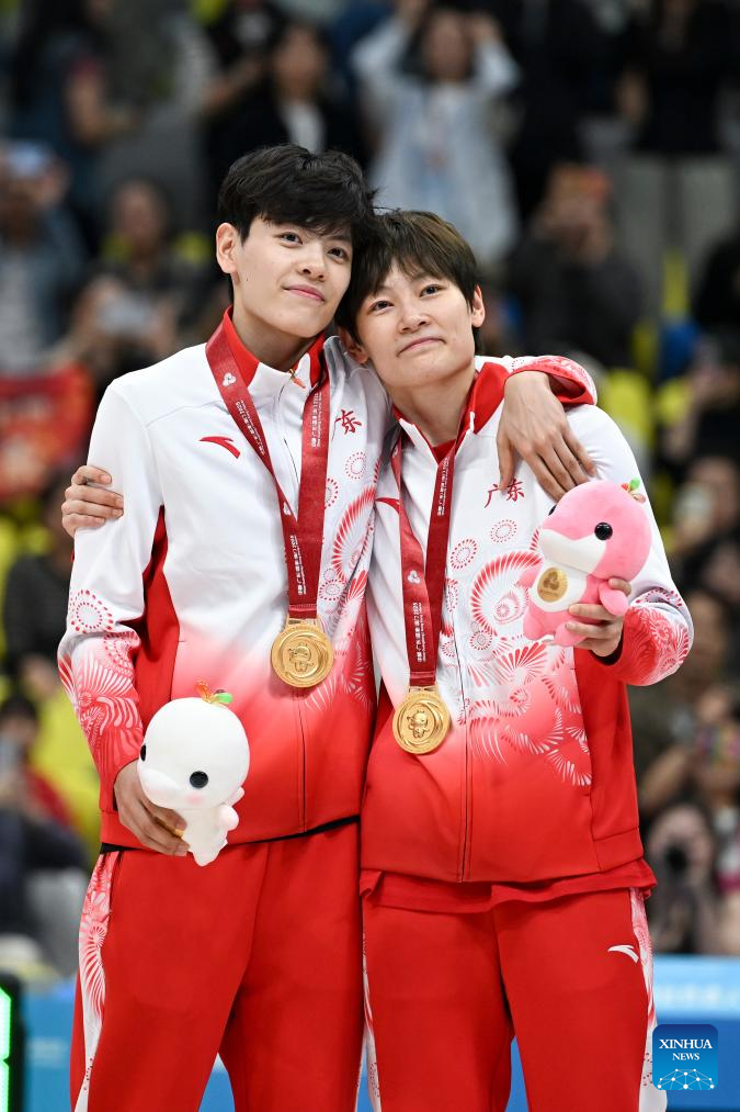 Yang Shuyu (L) of Guangdong pose with her teammate Yang Liwei during the awarding ceremony for basketball women's at China's 15th National Games in Foshan, south China's Guangdong Province, Nov. 15, 2025. (Xinhua/Zou Jingyi)
