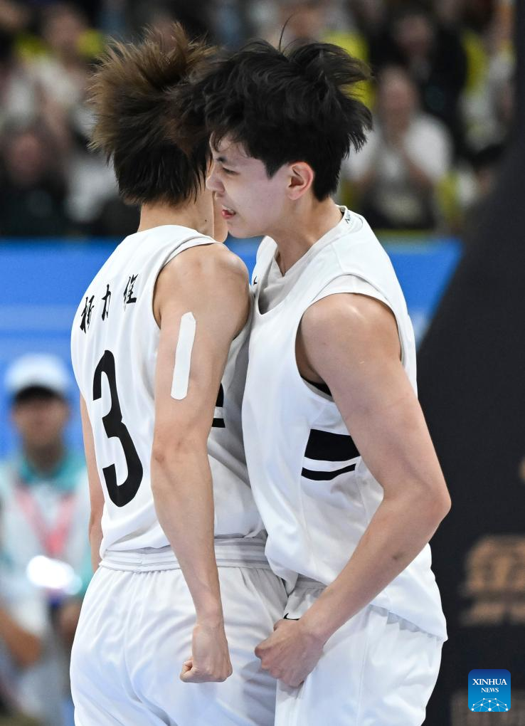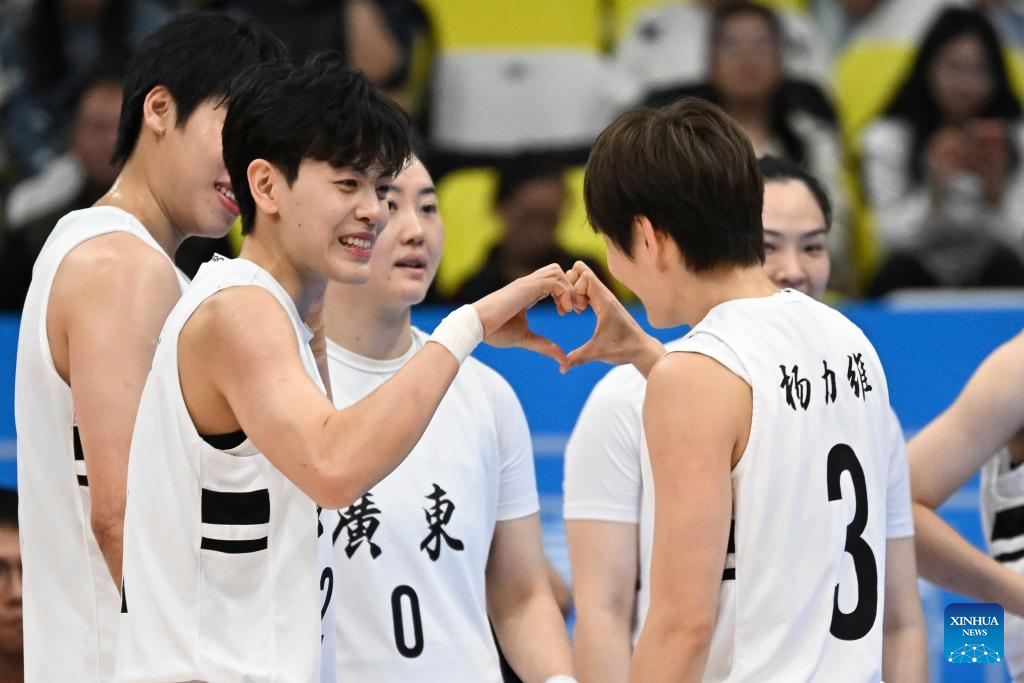 Yang Shuyu (R) of Guangdong cheers for scoring with her teammate Yang Liwei during the basketball women's final match between Guangdong and Sichuan at China's 15th National Games in Foshan, south China's Guangdong Province, Nov. 15, 2025. (Xinhua/Zou Jingyi)