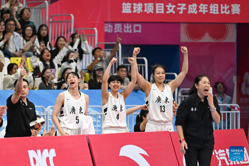 Players of Guangdong cheer for scoring during the basketball women's final match between Guangdong and Sichuan at China's 15th National Games in Foshan, south China's Guangdong Province, Nov. 15, 2025. (Xinhua/Zou Jingyi)