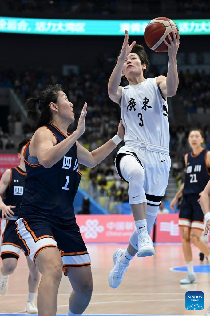Li Meng (L) of Sichuan goes for a layup during the basketball women's final match between Guangdong and Sichuan at China's 15th National Games in Foshan, south China's Guangdong Province, Nov. 15, 2025. (Xinhua/Zou Jingyi)