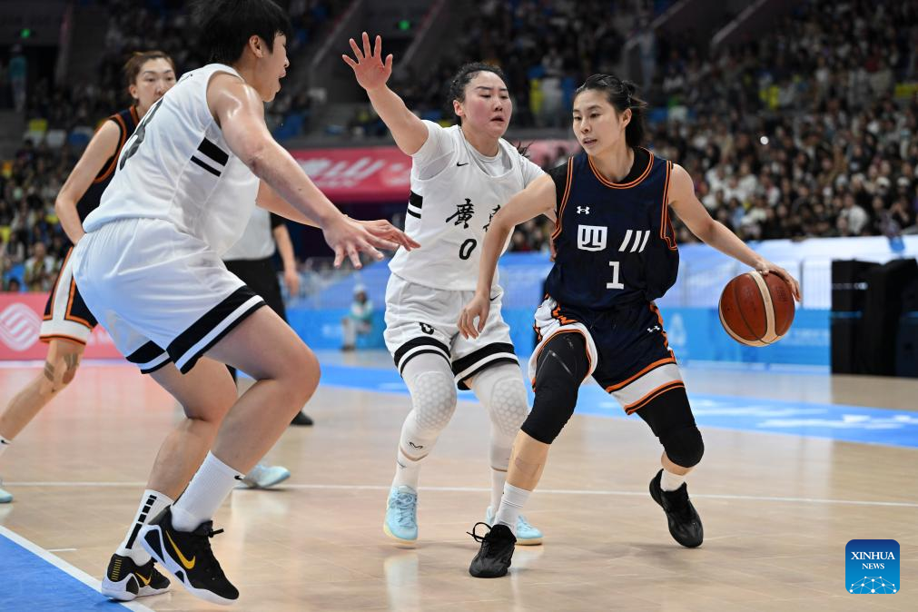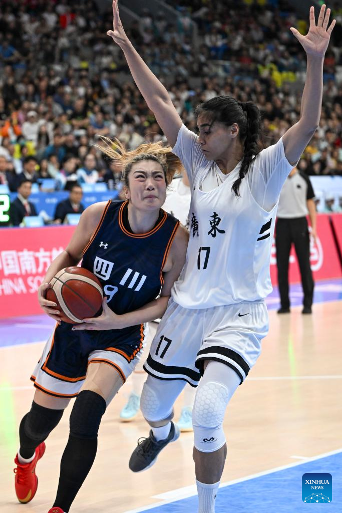 Wang Siyu (1st R) of Sichuan vies with Wu Tongtong of Guangdong during the basketball women's final match between Guangdong and Sichuan at China's 15th National Games in Foshan, south China's Guangdong Province, Nov. 15, 2025. (Xinhua/Zou Jingyi)