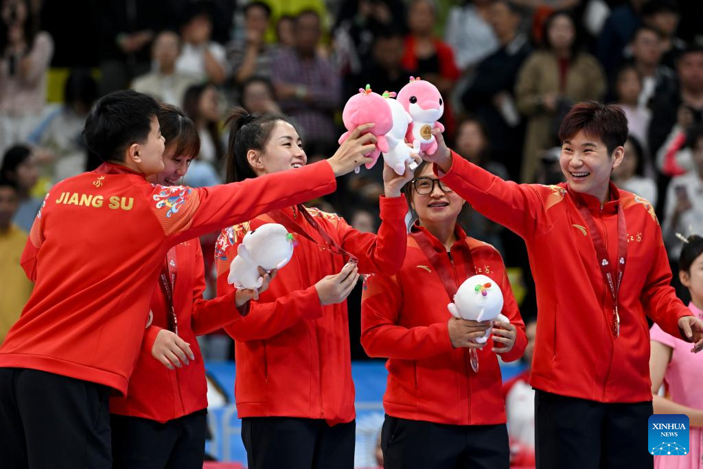 Bronze medalists team Jiangsu interact during the awarding ceremony for basketball women's at China's 15th National Games in Foshan, south China's Guangdong Province, Nov. 15, 2025. (Xinhua/Zou Jingyi)