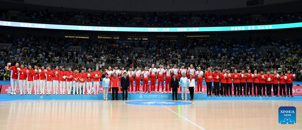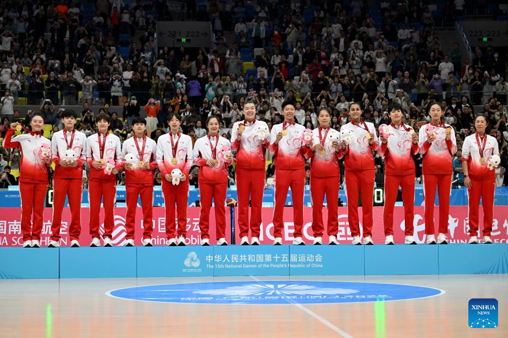 Gold medalists team Guangdong pose during the awarding ceremony for basketball women's at China's 15th National Games in Foshan, south China's Guangdong Province, Nov. 15, 2025. (Xinhua/Zou Jingyi)