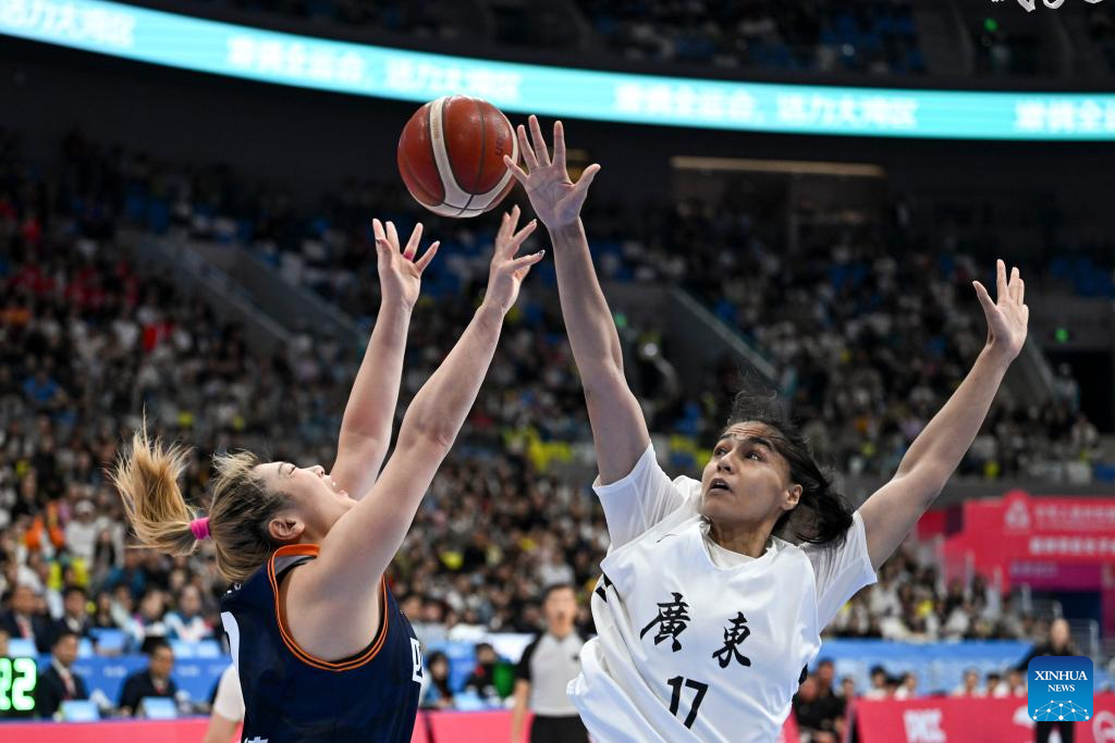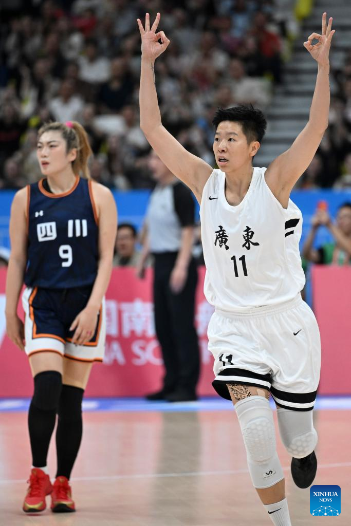 Huang Jingsi (R) of Guangdong cheers for scoring during the basketball women's final match between Guangdong and Sichuan at China's 15th National Games in Foshan, south China's Guangdong Province, Nov. 15, 2025. (Xinhua/Zou Jingyi)