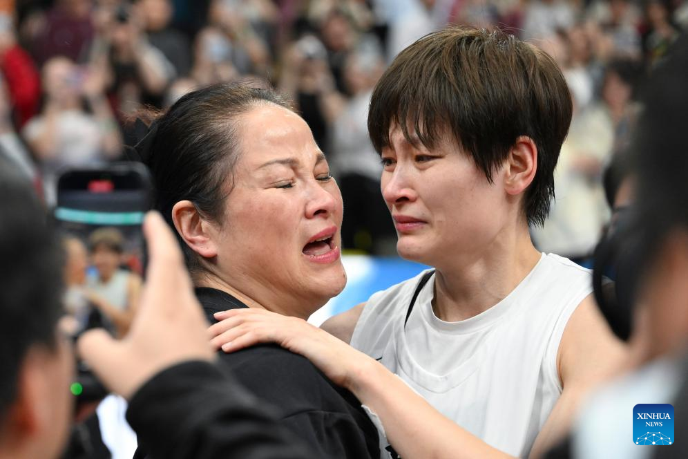 Yang Liwei (R) of Guangdong and her mother react after winning the basketball women's final match between Guangdong and Sichuan at China's 15th National Games in Foshan, south China's Guangdong Province, Nov. 15, 2025. (Xinhua/Zou Jingyi)