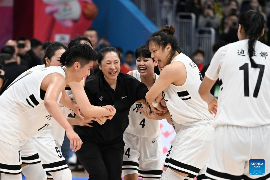 Players of team Guangdong celebrate with their coach Zheng Wei after winning the basketball women's final match between Guangdong and Sichuan at China's 15th National Games in Foshan, south China's Guangdong Province, Nov. 15, 2025. (Xinhua/Zou Jingyi)