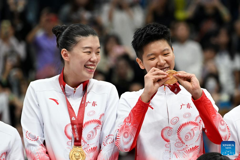 Huang Jingsi (R), player of gold medalists team Guangdong, reacts during the awarding ceremony for basketball women's match at China's 15th National Games in Foshan, south China's Guangdong Province, Nov. 15, 2025. (Xinhua/Zou Jingyi)