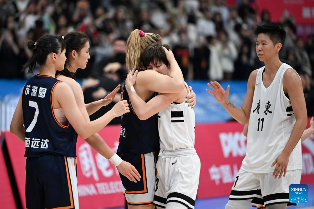 Li Meng (C) of Sichuan hugs Yang Liwei (2nd R) of Guangdong after basketball women's final match between Guangdong and Sichuan at China's 15th National Games in Foshan, south China's Guangdong Province, Nov. 15, 2025. (Xinhua/Zou Jingyi)