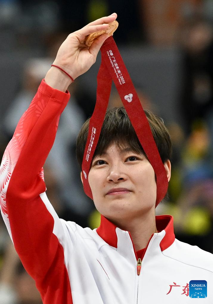 Yang Liwei, player of gold medalists team Guangdong, reacts during the awarding ceremony for basketball women's at China's 15th National Games in Foshan, south China's Guangdong Province, Nov. 15, 2025. (Xinhua/Zou Jingyi)