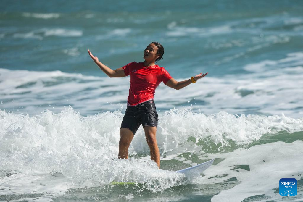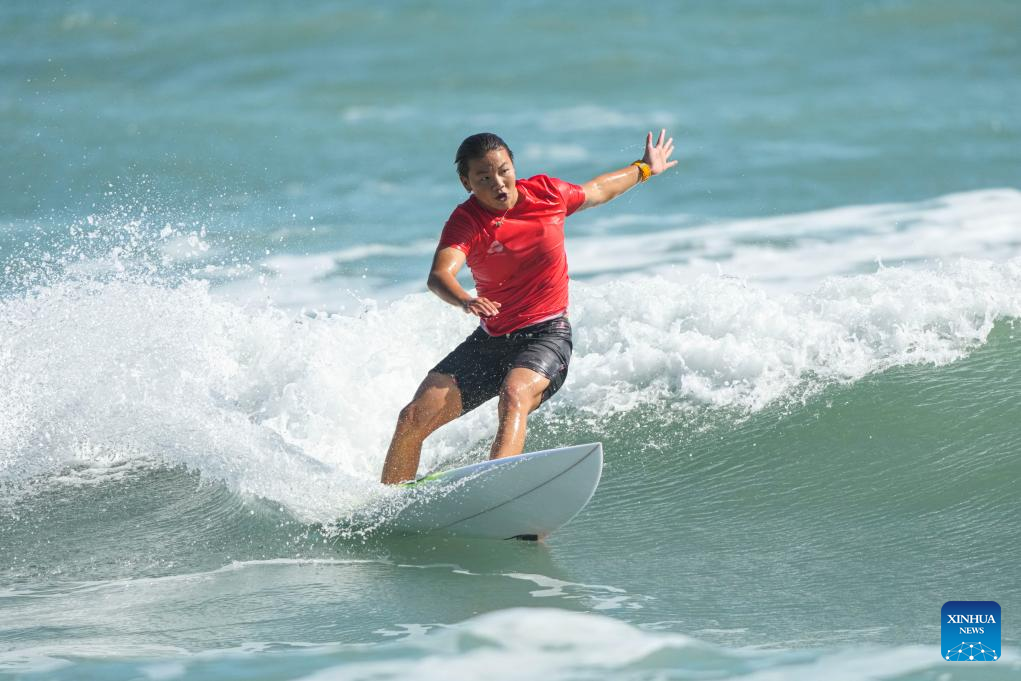 Yang Siqi of Sichuan competes during the women's final of shortboard surfing at China's 15th National Games in Nan'ao, south China's Guangdong Province, Nov. 16, 2025. (Xinhua/Liu Kun)