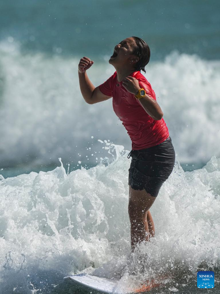 Yang Siqi of Sichuan celebrates after winning the women's final of shortboard surfing at China's 15th National Games in Nan'ao, south China's Guangdong Province, Nov. 16, 2025. (Xinhua/Liu Kun)