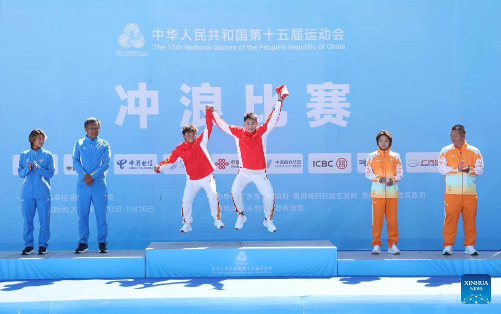 Yang Siqi (L) of Sichuan celebrates with her teammate after winning the women's final of shortboard surfing at China's 15th National Games in Nan'ao, south China's Guangdong Province, Nov. 16, 2025. (Xinhua/Liu Kun)