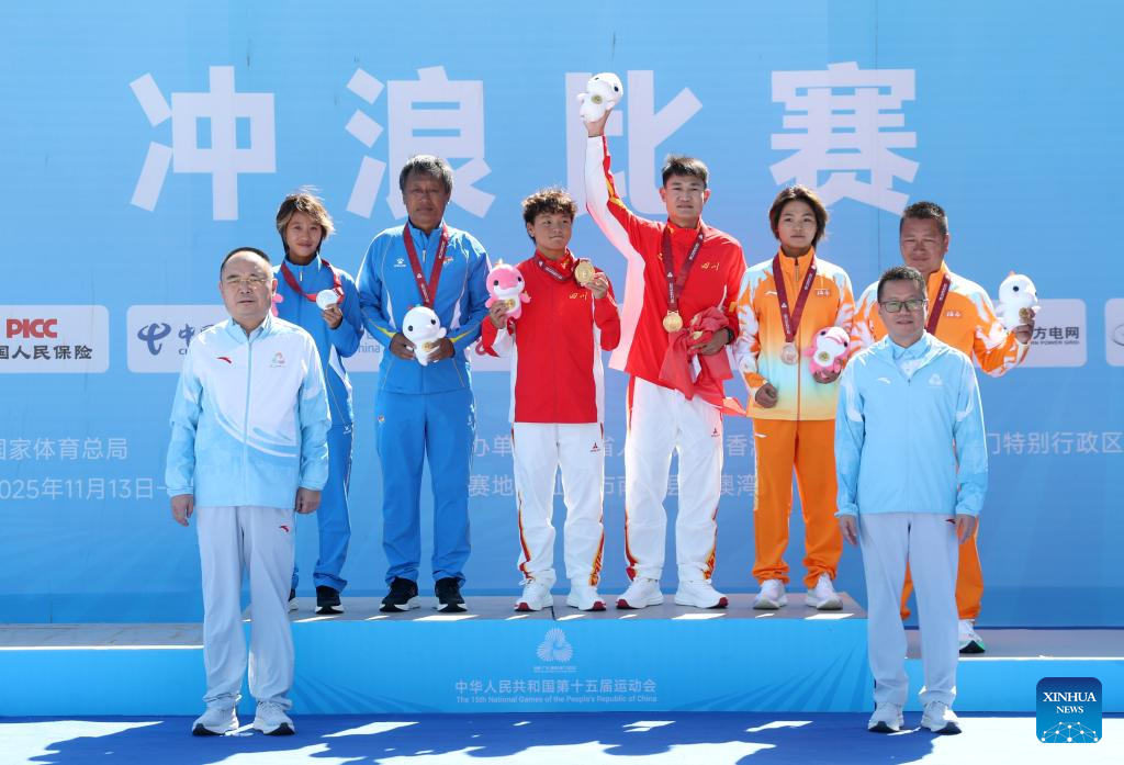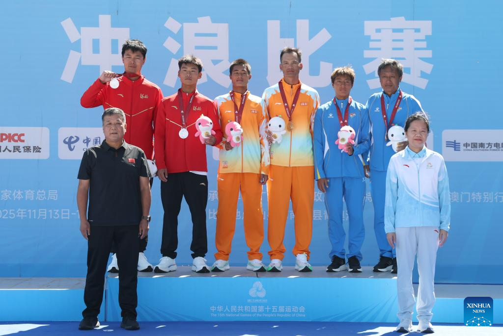 Gold medalist Wu Shidong (3rd L, back) of Hainan, silver medalist Dong Zihao (2nd L, back) of Hebei and bronze medalist Jiang Shulou (2nd R, back) of Liaoning pose during the awarding ceremony for the men's shortboard surfing at China's 15th National Games in Nan'ao, south China's Guangdong Province, Nov. 16, 2025. (Xinhua/Lu Hanxin)