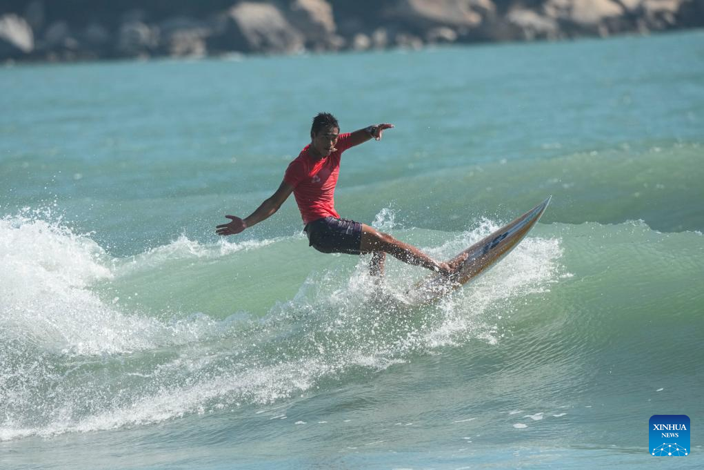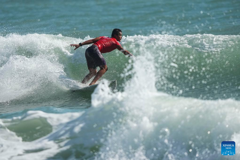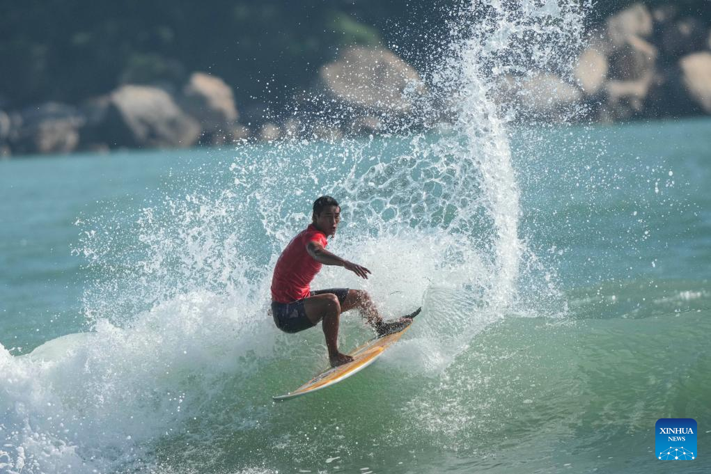 Wu Shidong of Hainan competes during the men's final of shortboard surfing at China's 15th National Games in Nan'ao, south China's Guangdong Province, Nov. 16, 2025. (Xinhua/Liu Kun)