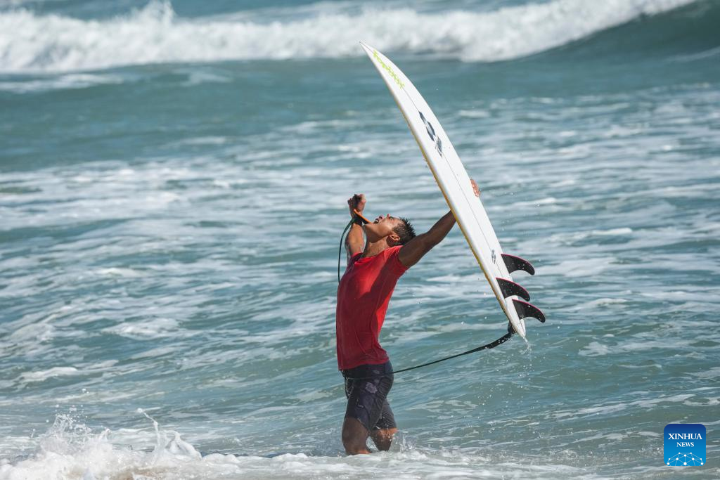 Wu Shidong of Hainan celebrates after winning the men's final of shortboard surfing at China's 15th National Games in Nan'ao, south China's Guangdong Province, Nov. 16, 2025. (Xinhua/Liu Kun)