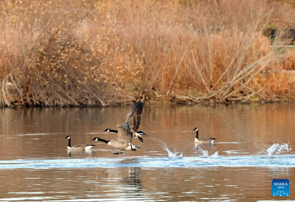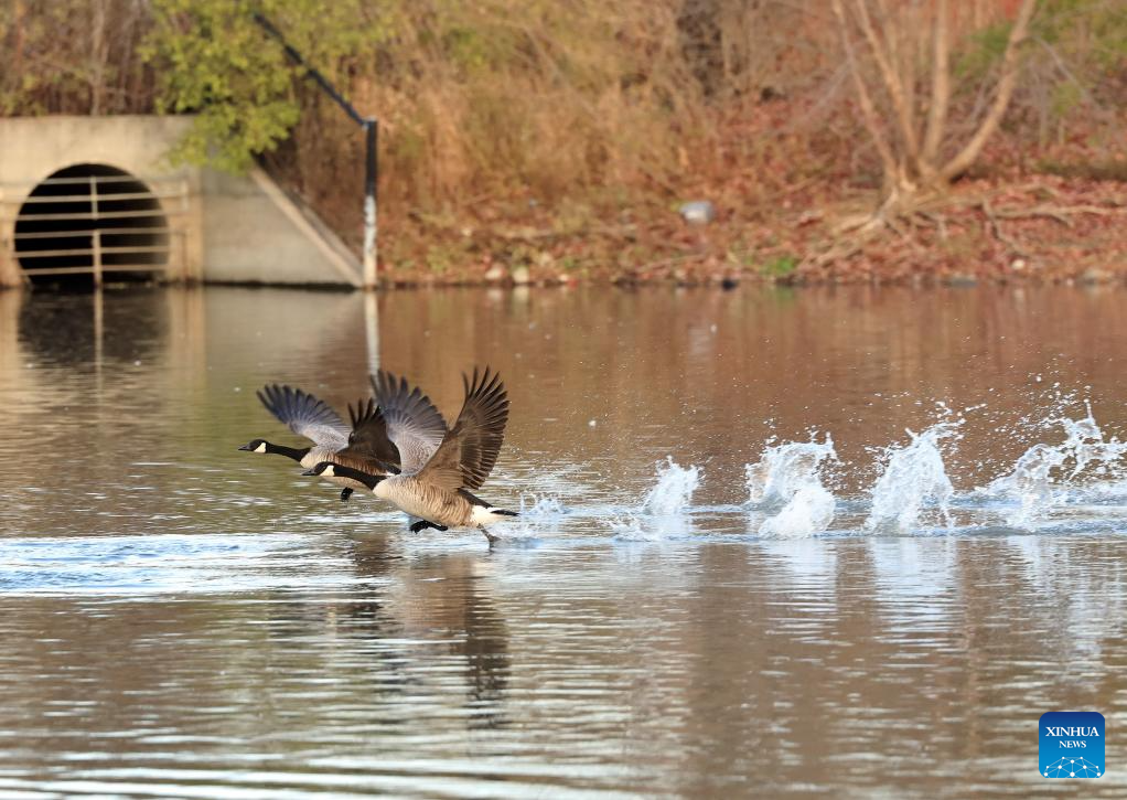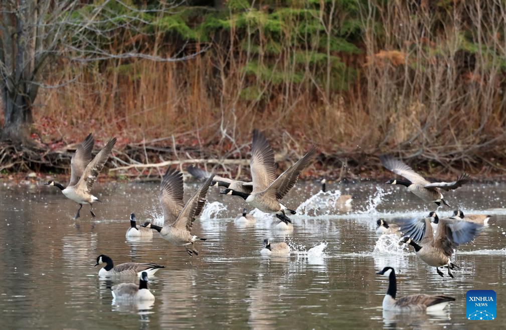 Canada geese (Branta canadensis) migrating to the east coast of the United States are pictured at Berczy Park North in Markham, Ontario, Canada, Nov. 14, 2025. (Photo by Yang Shu/Xinhua)