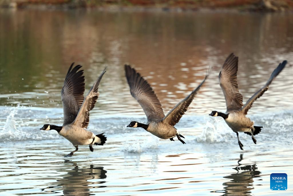 Three Canada geese (Branta canadensis) migrating to the east coast of the United States are pictured at Berczy Park North in Markham, Ontario, Canada, Nov. 14, 2025. (Photo by Yang Shu/Xinhua)