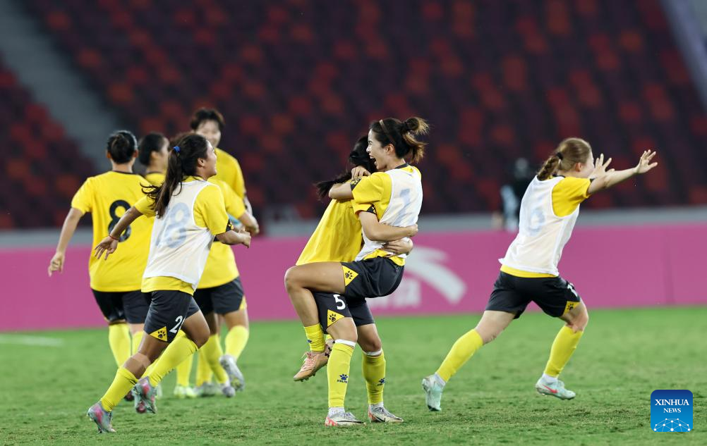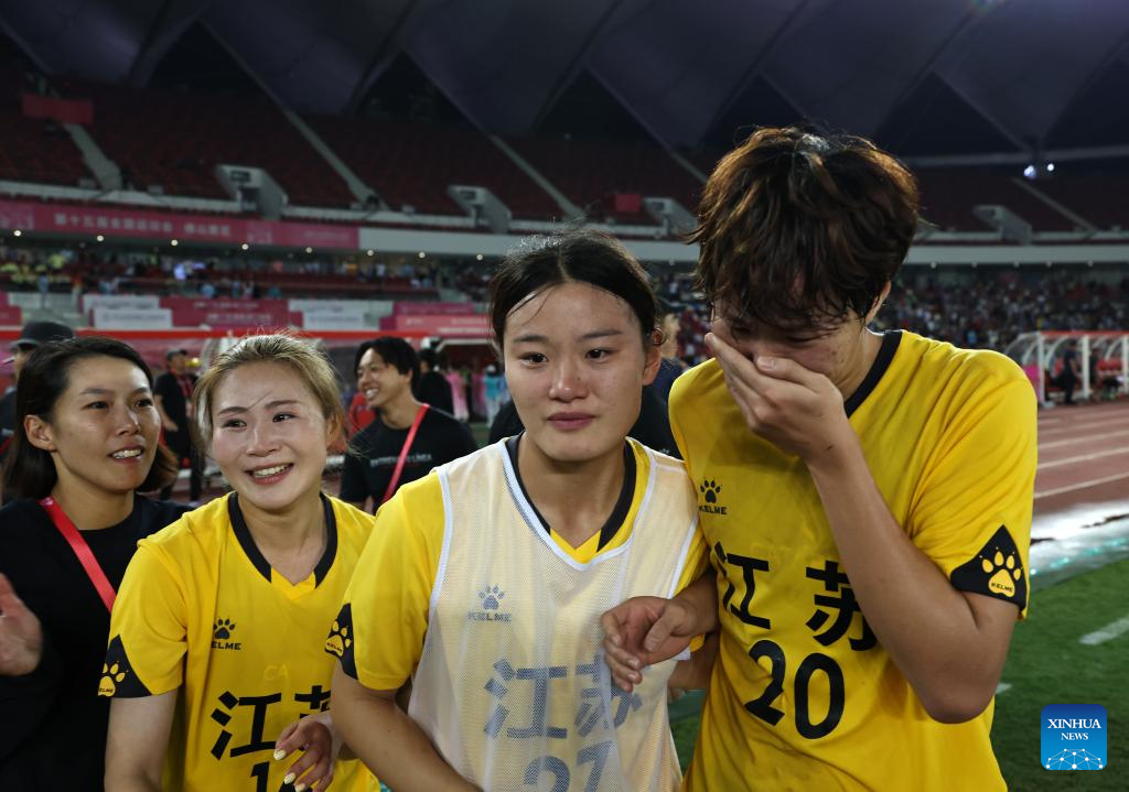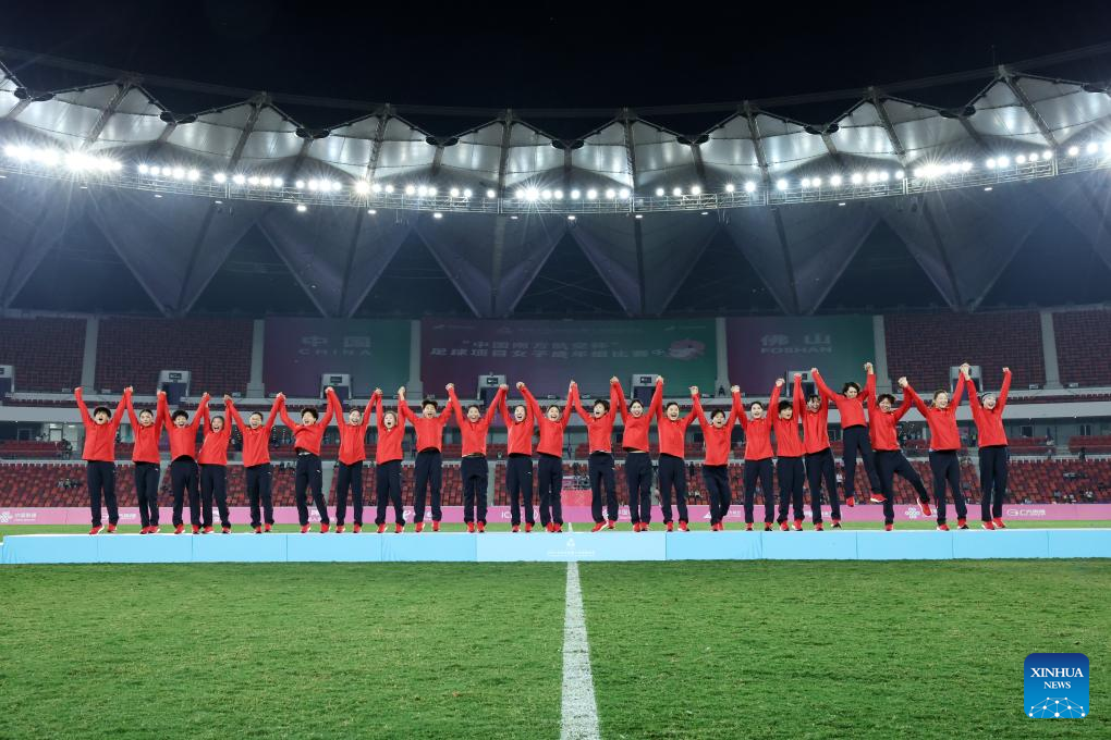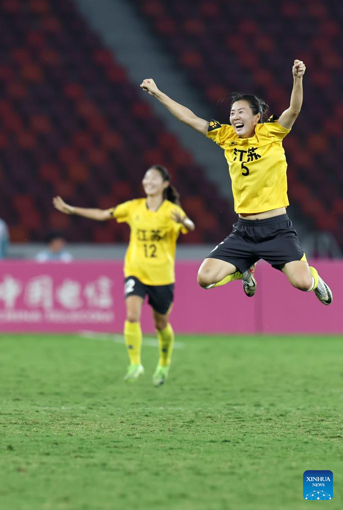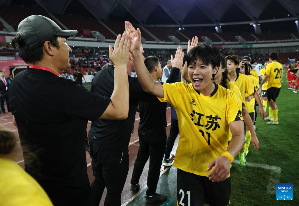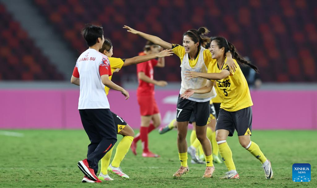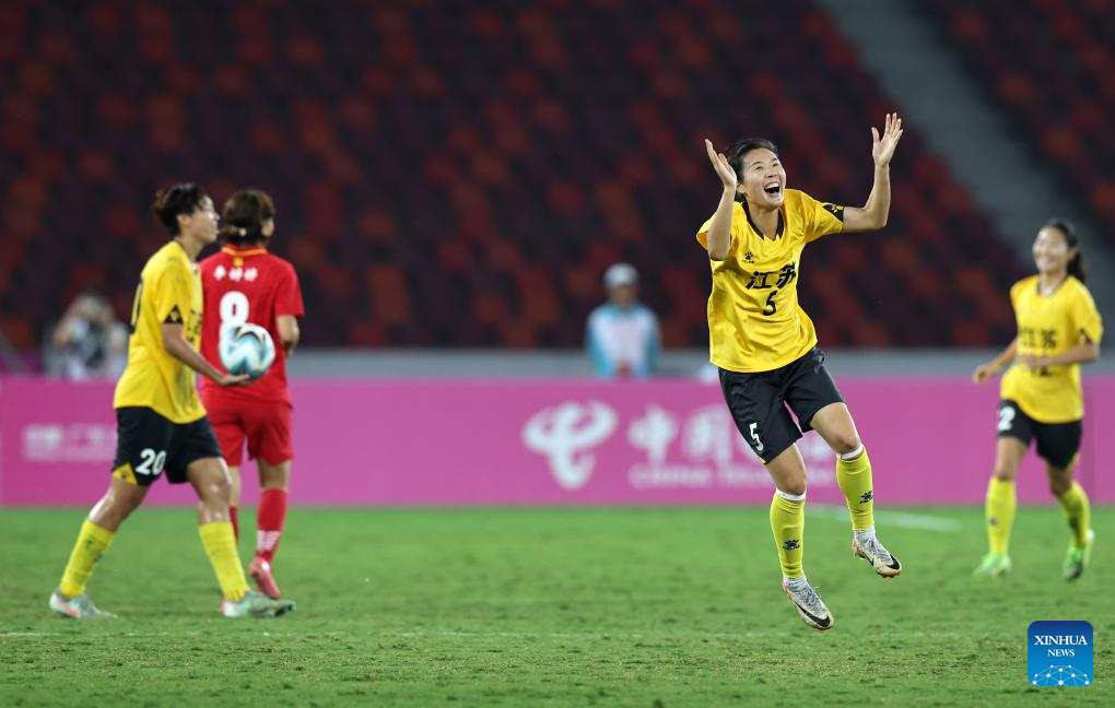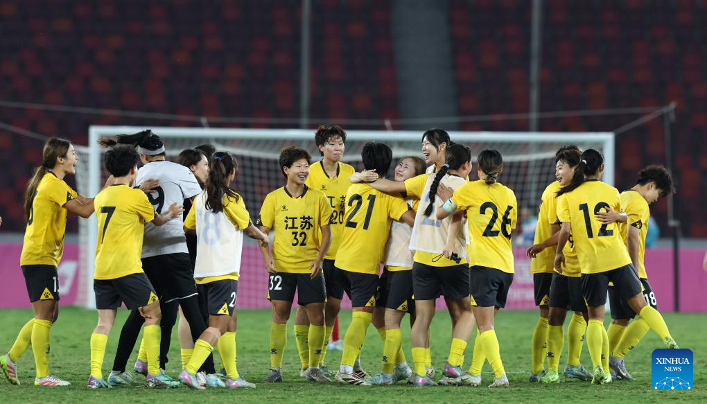 Players of team Jiangsu celebrate after defeating team Hubei in the football women's final match between Hubei and Jiangsu at China's 15th National Games in Foshan, south China's Guangdong Province, Nov. 15, 2025. (Xinhua/Wang Peng)