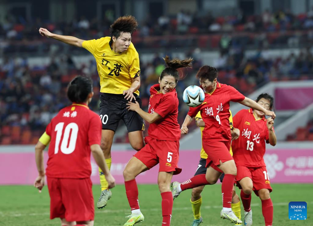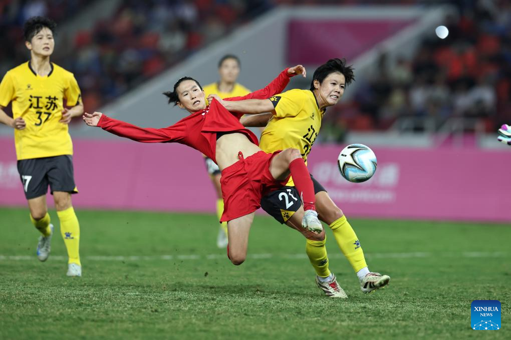Shao Ziqin (2nd L) of Jiangsu vies with Wu Haiyan (3rd L) and Yan Qi (2nd R) of Hubei during the football women's final match between Hubei and Jiangsu at China's 15th National Games in Foshan, south China's Guangdong Province, Nov. 15, 2025. (Xinhua/Wang Peng)
