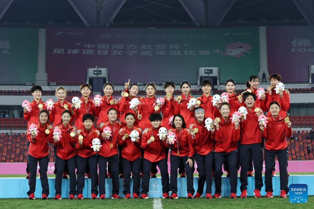 Gold medalists team Jiangsu pose during the awarding ceremony for football women's match at China's 15th National Games in Foshan, south China's Guangdong Province, Nov. 15, 2025. (Xinhua/Wang Peng)