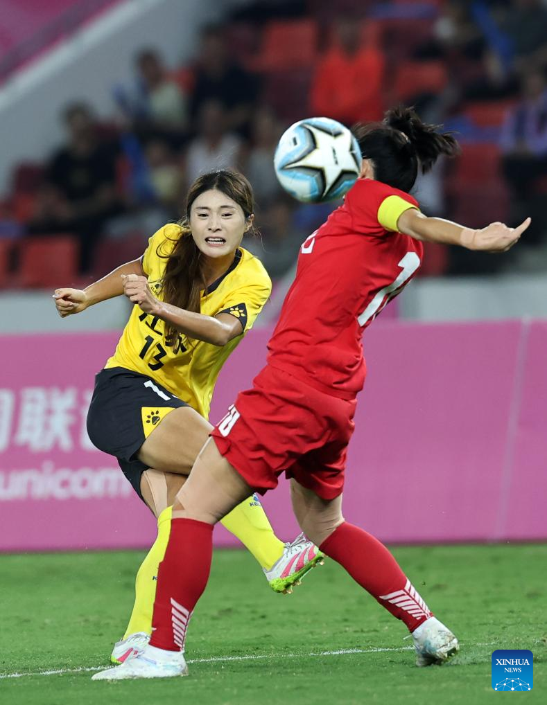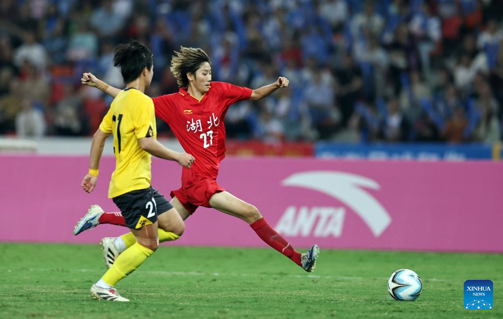 Jin Kun (L) of Jiangsu shoots during the football women's final match between Hubei and Jiangsu at China's 15th National Games in Foshan, south China's Guangdong Province, Nov. 15, 2025. (Xinhua/Wang Peng)