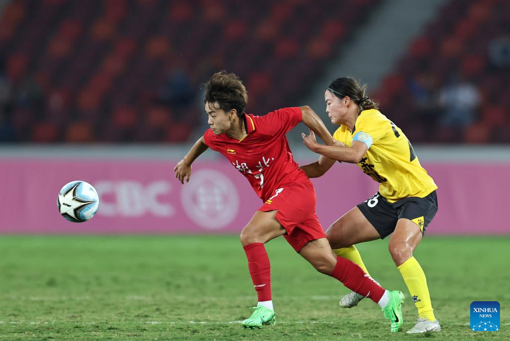 Wang Shuang (L) of Hubei vies with Li Mengwen of Jiangsu during the football women's final match between Hubei and Jiangsu at China's 15th National Games in Foshan, south China's Guangdong Province, Nov. 15, 2025. (Xinhua/Wang Peng)