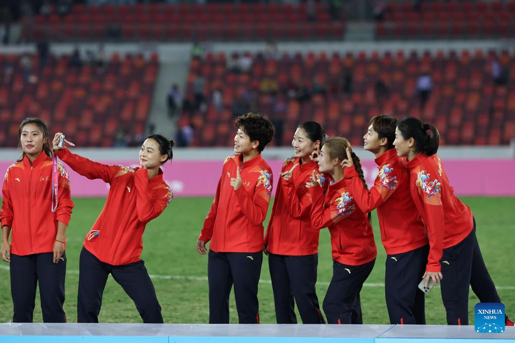 Gold medalists team Jiangsu take selfies after the awarding ceremony for football women's match at China's 15th National Games in Foshan, south China's Guangdong Province, Nov. 15, 2025. (Xinhua/Wang Peng)