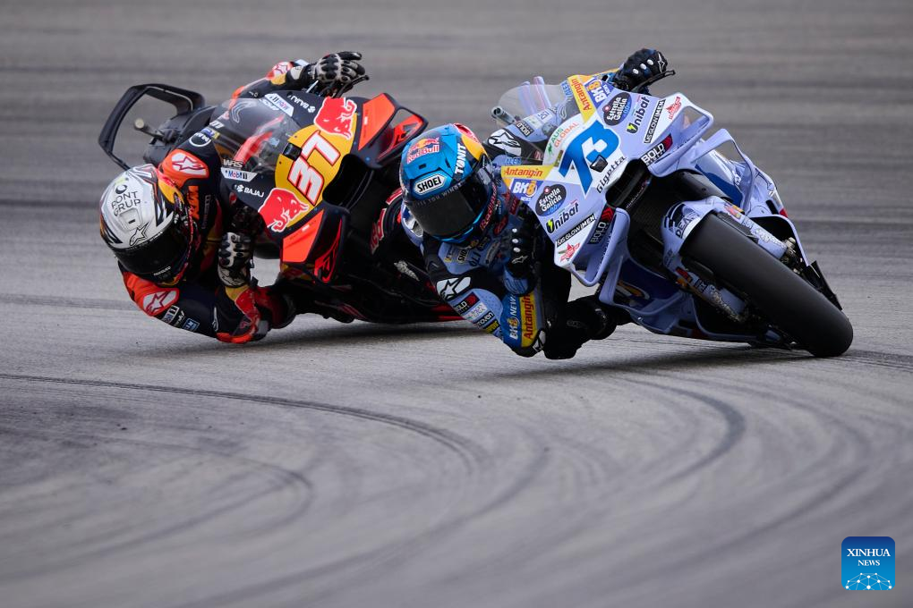 BK8 Gresini Racing MotoGP's Alex Marquez (R) of Spain competes during the sprint race of the MotoGP Valencia Grand Prix 2025 at Ricardo Tormo Circuit, Valencia, Spain, Nov. 15, 2025. (Str/Xinhua)