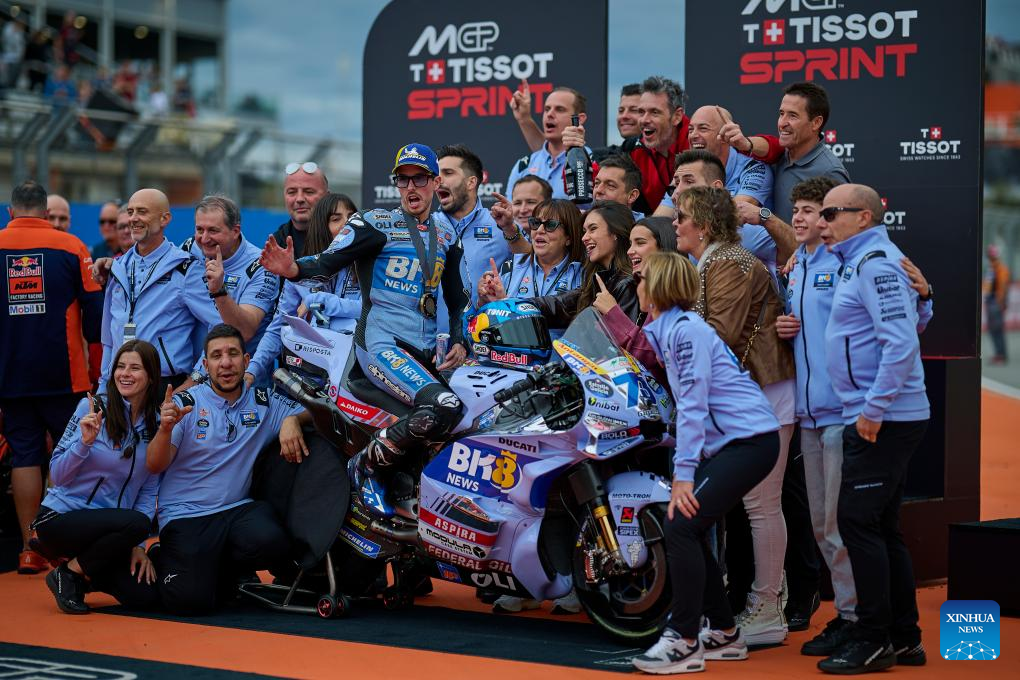 BK8 Gresini Racing MotoGP's Alex Marquez (C) of Spain celebrates with his team members after winning the sprint race of the MotoGP Valencia Grand Prix 2025 at Ricardo Tormo Circuit, Valencia, Spain, Nov. 15, 2025. (Str/Xinhua)