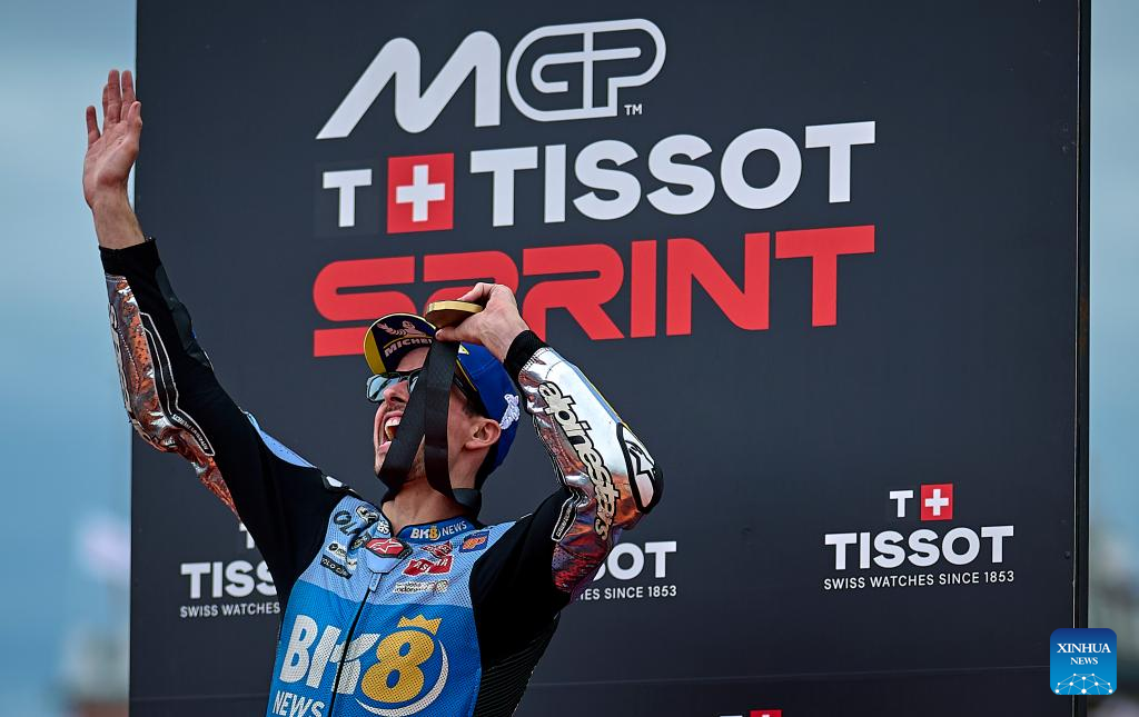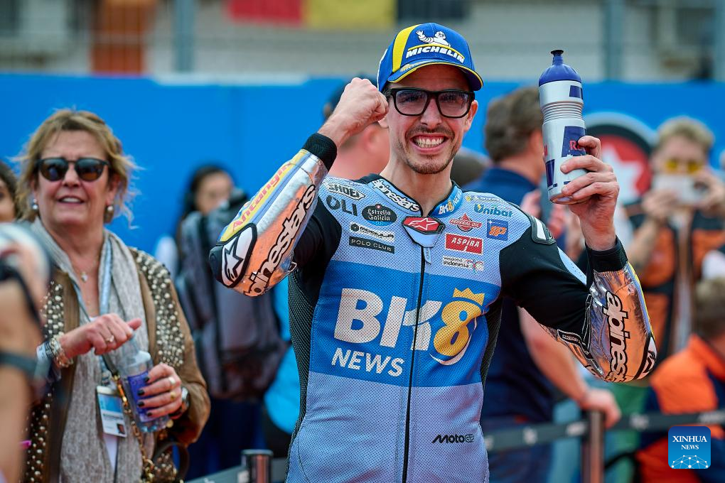 First-placed BK8 Gresini Racing MotoGP's Alex Marquez of Spain celebrates the victory after the sprint race of the MotoGP Valencia Grand Prix 2025 at Ricardo Tormo Circuit, Valencia, Spain, Nov. 15, 2025. (Str/Xinhua)