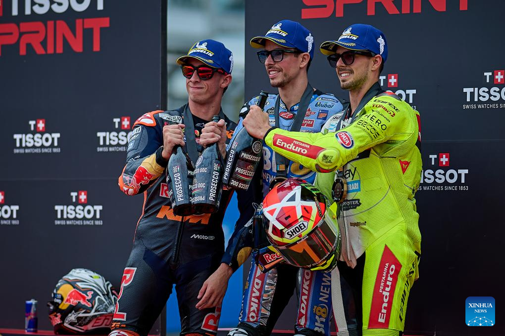 First-placed BK8 Gresini Racing MotoGP's Alex Marquez (C) of Spain, second-placed Red Bull KTM Factory Racing's Pedro Ascosta (L) of Spain and third-placed Pertamina Enduro VR46 Racing Team's Fabio Di Giannantonio of Italy pose after the sprint race of the MotoGP Valencia Grand Prix 2025 at Ricardo Tormo Circuit, Valencia, Spain, Nov. 15, 2025. (Str/Xinhua)