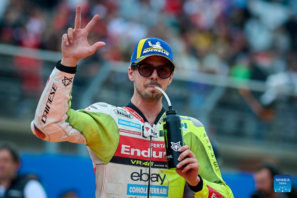 Pertamina Enduro VR46 Racing Team's Fabio Di Giannantonio of Italy reacts after the sprint race of the MotoGP Valencia Grand Prix 2025 at Ricardo Tormo Circuit, Valencia, Spain, Nov. 15, 2025. (Str/Xinhua)