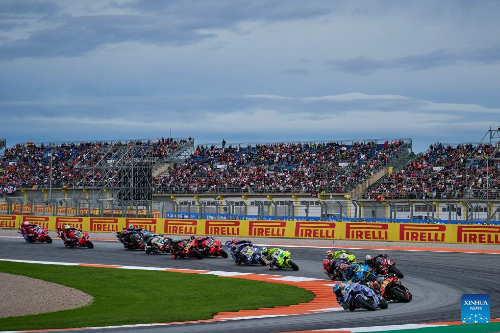 Riders compete during the sprint race of the MotoGP Valencia Grand Prix 2025 at Ricardo Tormo Circuit, Valencia, Spain, Nov. 15, 2025. (Str/Xinhua)