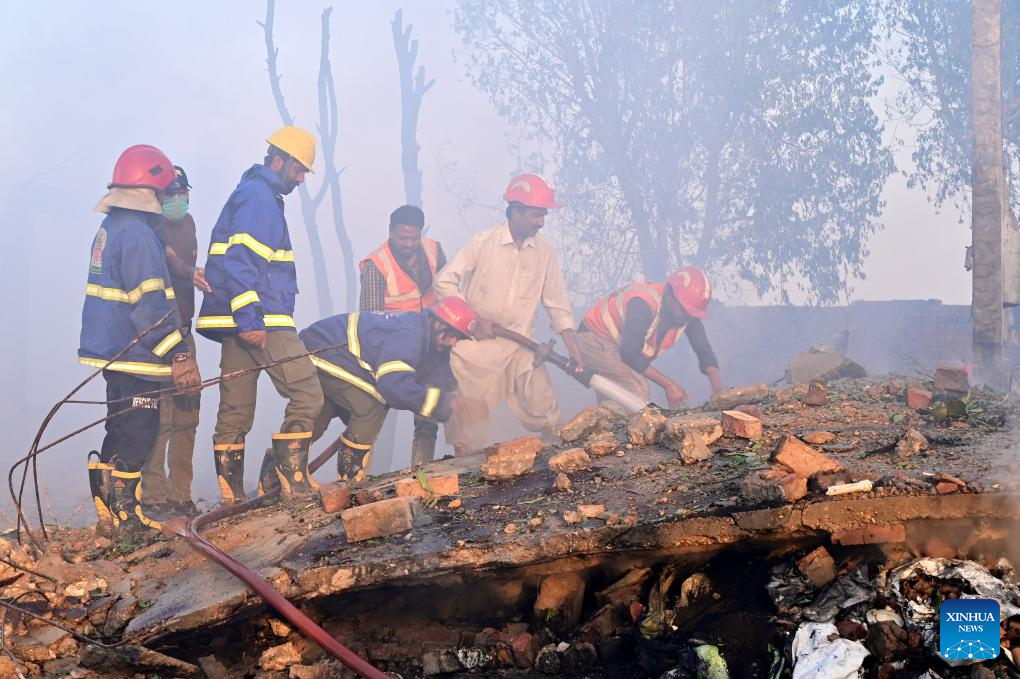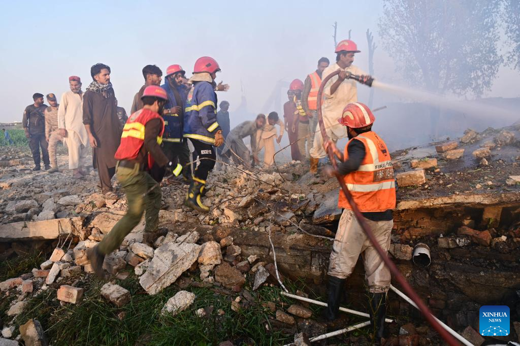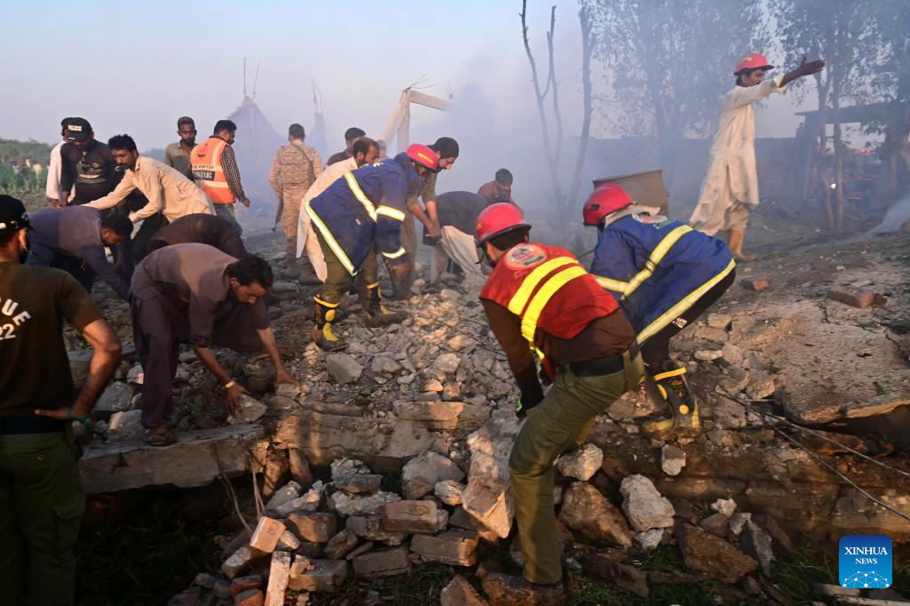 Rescuers search for victims in the rubble after a factory blast on the outskirts of Hyderabad in southern Pakistan's Sindh province, on Nov. 15, 2025. At least seven people were killed and seven others injured in a powerful explosion at a firecracker factory in southern Sindh province, officials said on Sunday. Authorities said the cause of the explosion was still under investigation. (Str/Xinhua)