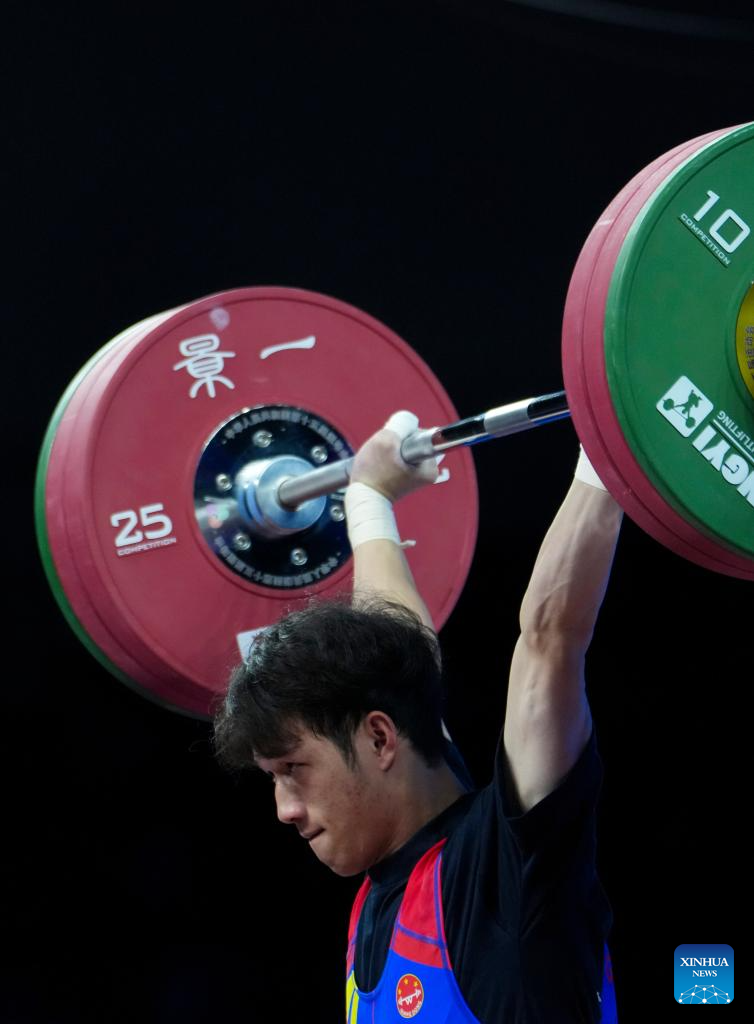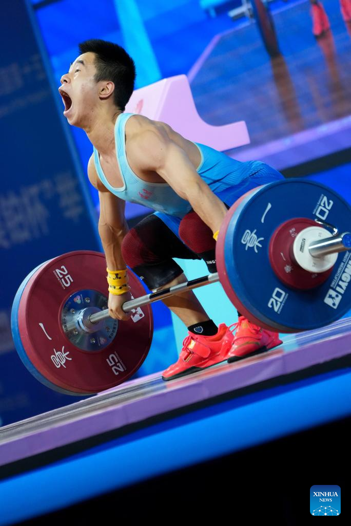 Zou Weibin of Hunan competes in clean and jerk during the weightlifting men's 55kg final at China's 15th National Games in Dongguan, south China's Guangdong Province, Nov. 16, 2025. (Xinhua/Yang Chenguang)