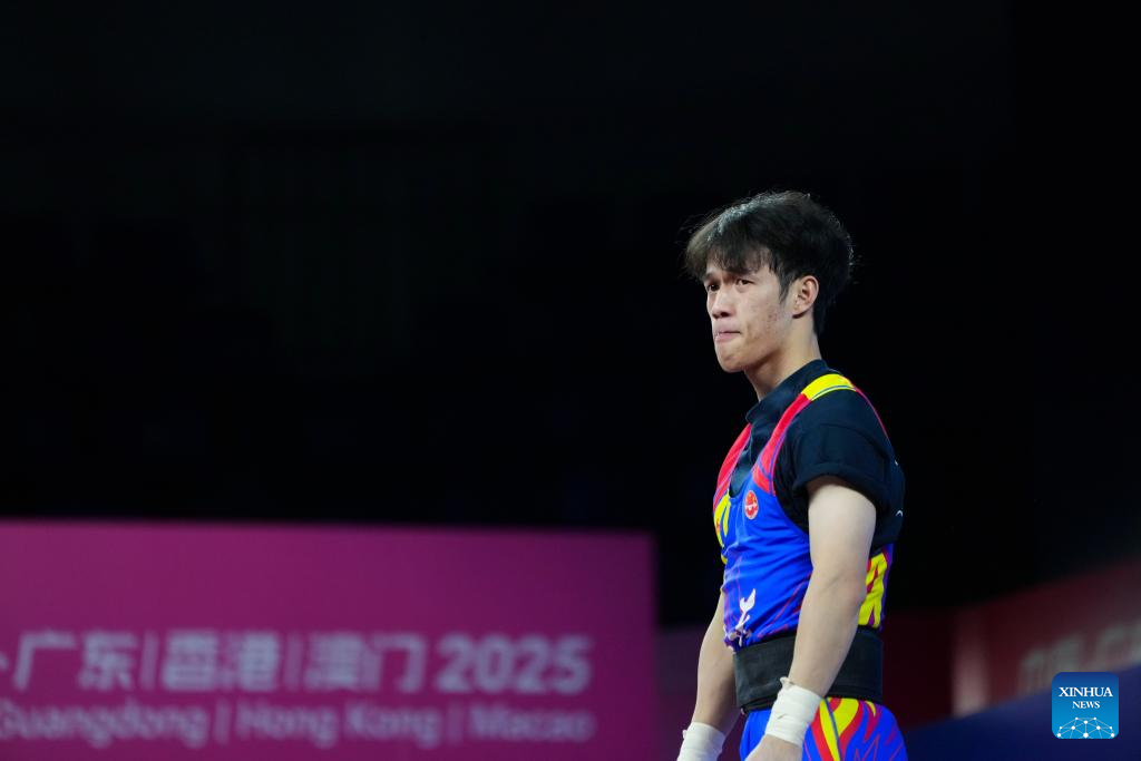 Wang Weidong of Guangdong competes in clean and jerk during the weightlifting men's 55kg final at China's 15th National Games in Dongguan, south China's Guangdong Province, Nov. 16, 2025. (Xinhua/Yang Chenguang)