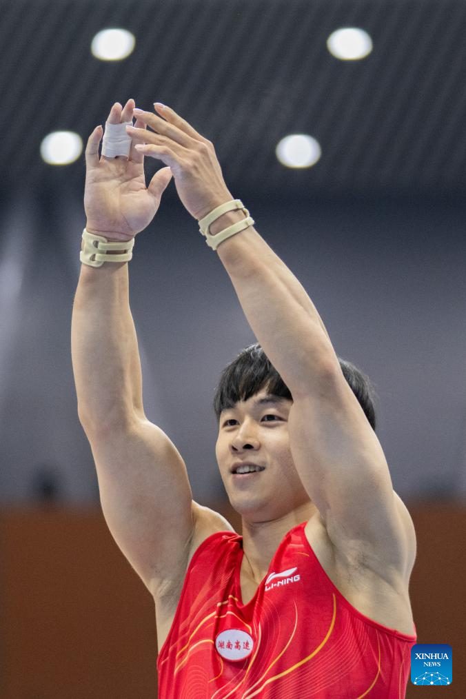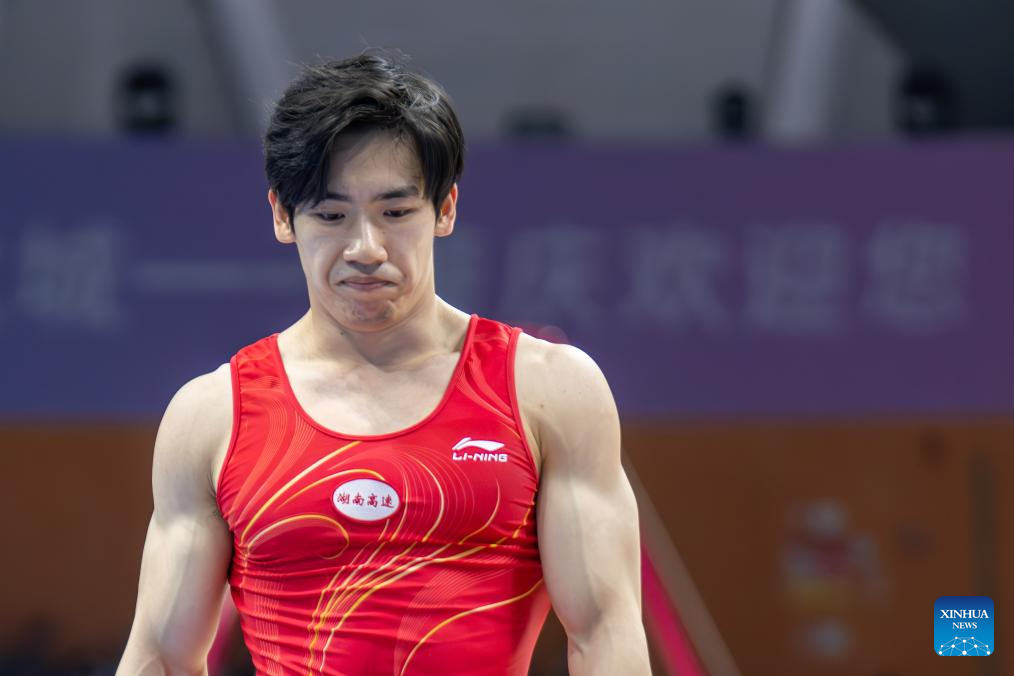 Zhang Boheng of Hunan reacts during the artistic gymnastics men's floor exercise final at China's 15th National Games in Zhaoqing, south China's Guangdong Province, Nov. 16, 2025. (Xinhua/Du Zixuan)