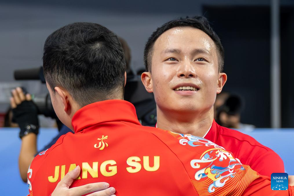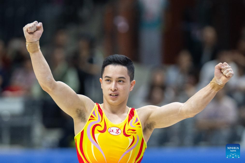 Yang Yanzhi of Jiangsu celebrates during the artistic gymnastics men's floor exercise final at China's 15th National Games in Zhaoqing, south China's Guangdong Province, Nov. 16, 2025. (Xinhua/Du Zixuan)