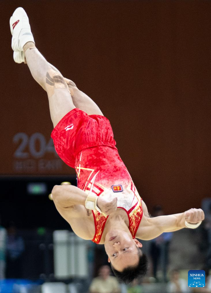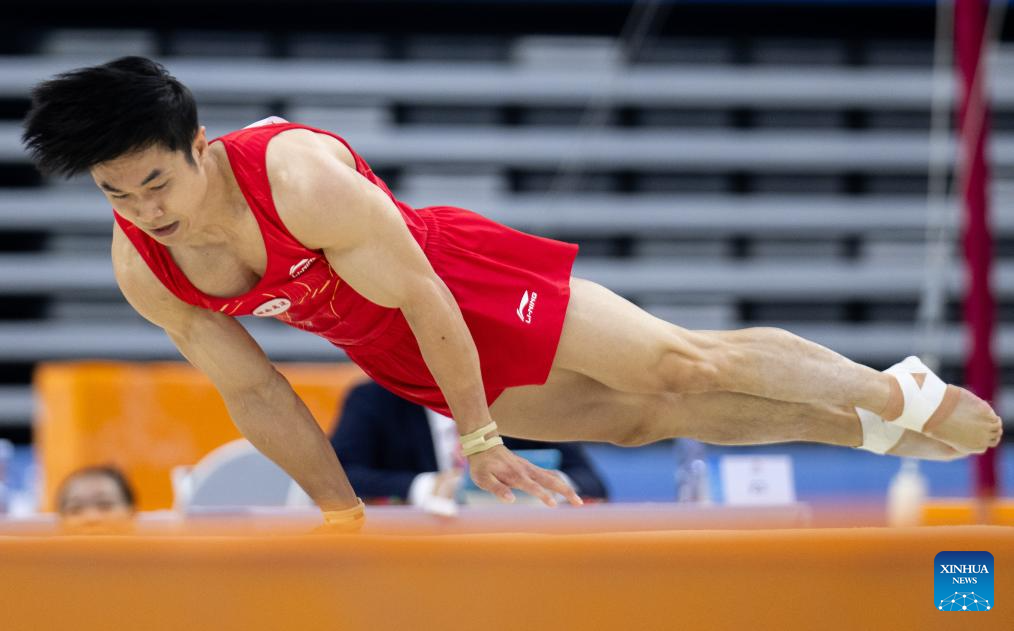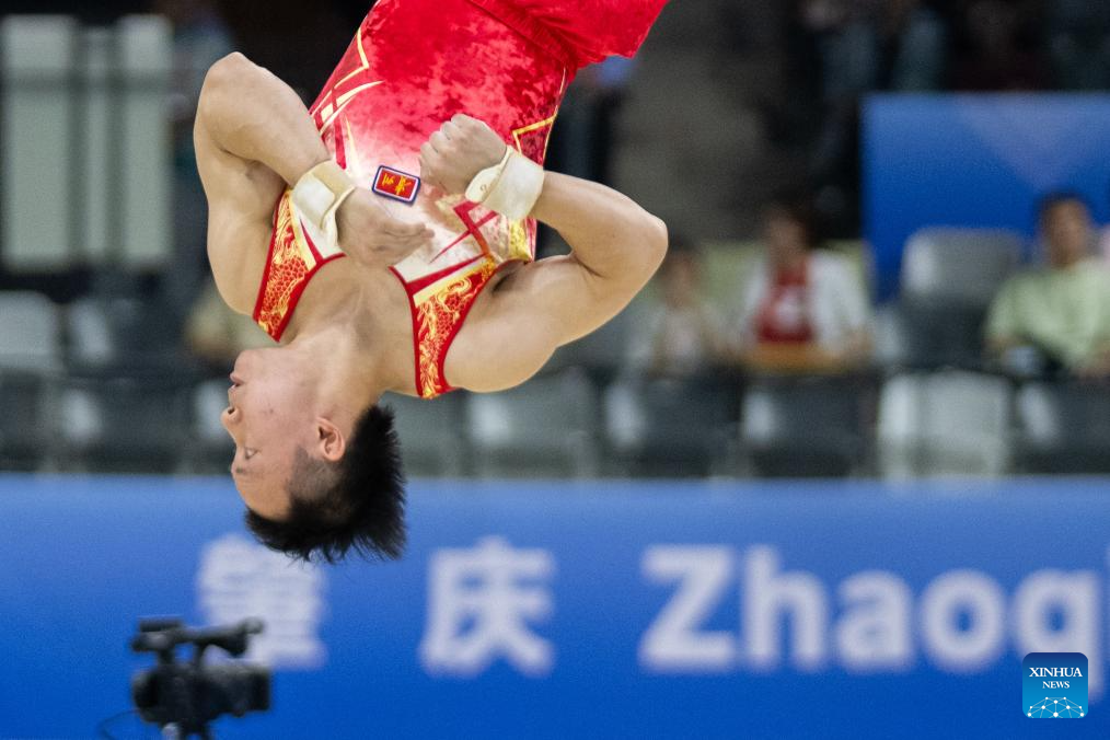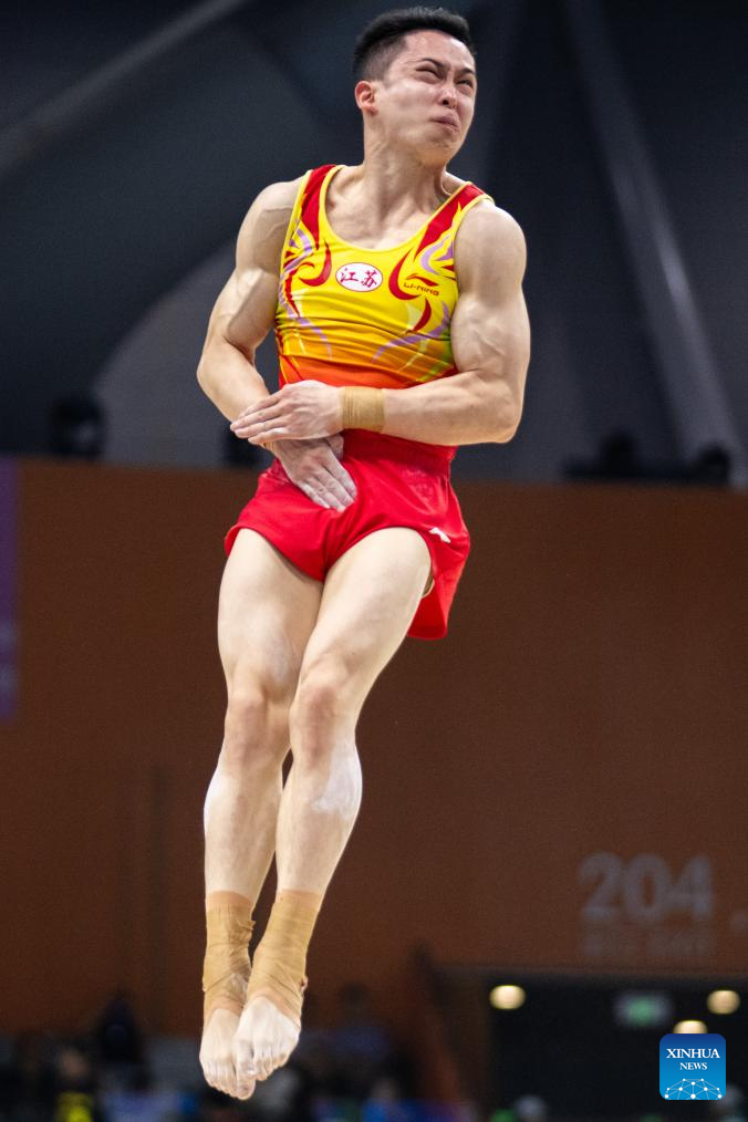 Zhang Boheng of Hunan competes during the artistic gymnastics men's floor exercise final at China's 15th National Games in Zhaoqing, south China's Guangdong Province, Nov. 16, 2025. (Xinhua/Du Zixuan)