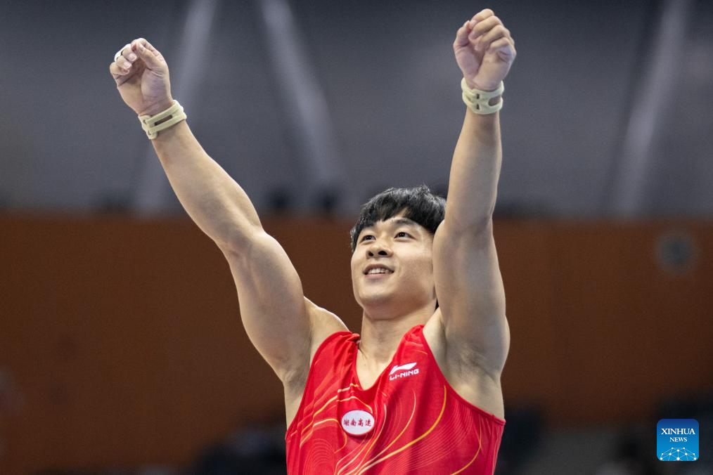 Yang Jiaxing of Hunan competes during the artistic gymnastics men's floor exercise final at China's 15th National Games in Zhaoqing, south China's Guangdong Province, Nov. 16, 2025. (Xinhua/Du Zixuan)