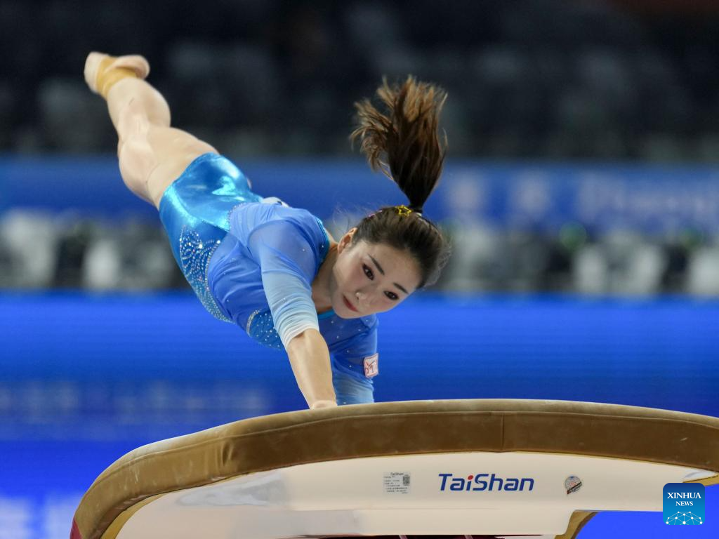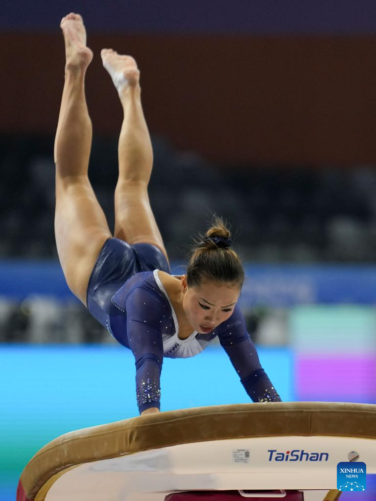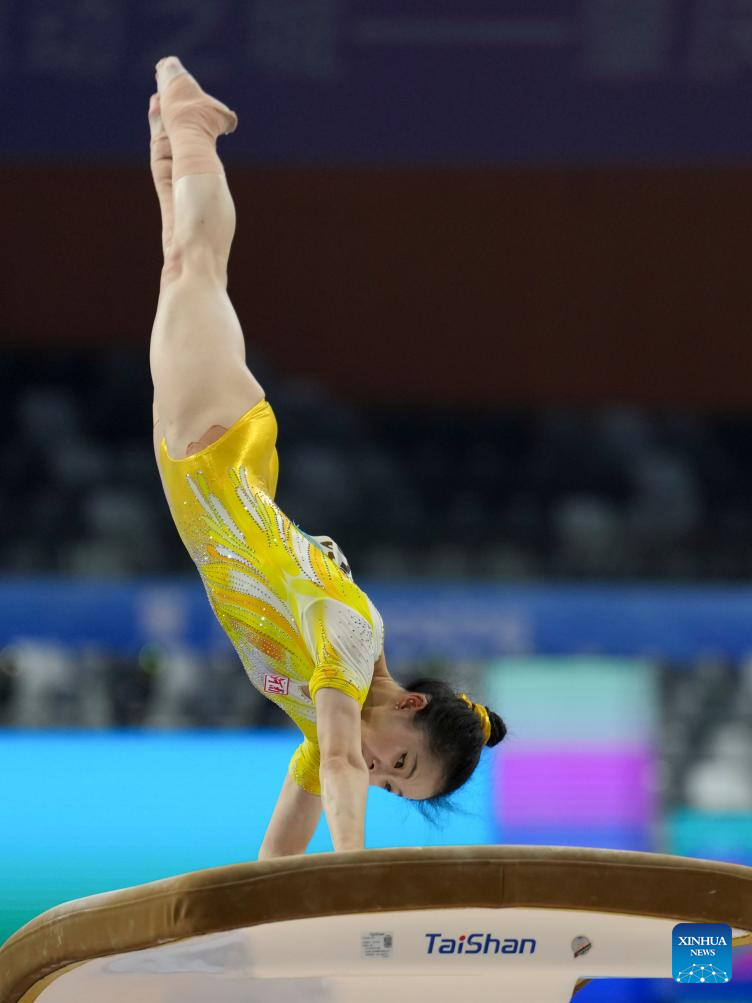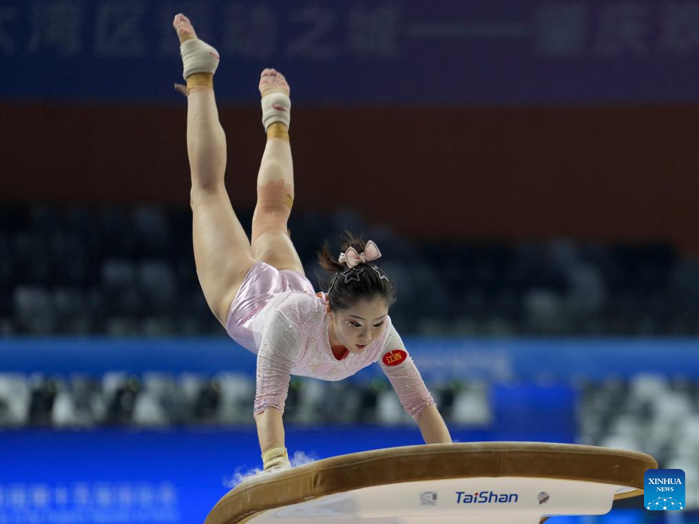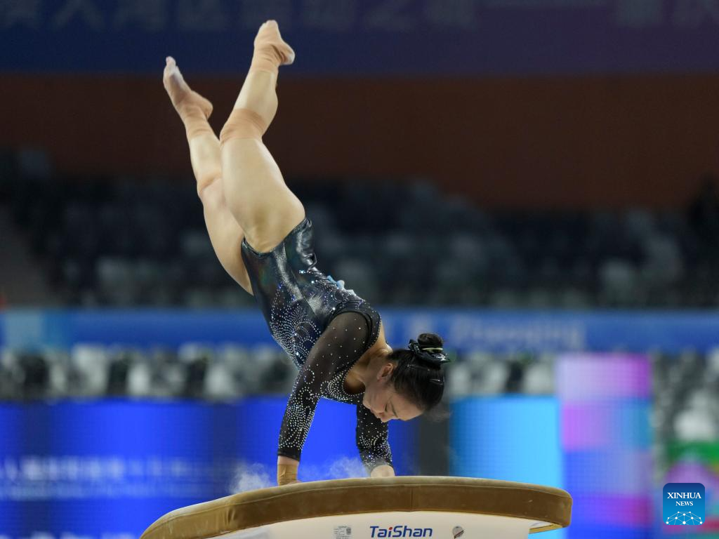 Yu Linmin of Fujian competes during the artistic gymnastics women's vault final at China's 15th National Games in Zhaoqing, south China's Guangdong Province, Nov. 16, 2025. (Xinhua/Xu Bingjie)
