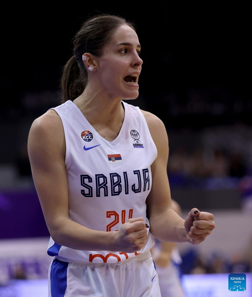 Serbia's Teodora Turudic reacts during the FIBA Women's EuroBasket 2027 Qualifiers match between Serbia and Portugal in Belgrade, Serbia, on Nov. 15, 2025. (Photo by Predrag Milosavljevic/Xinhua)