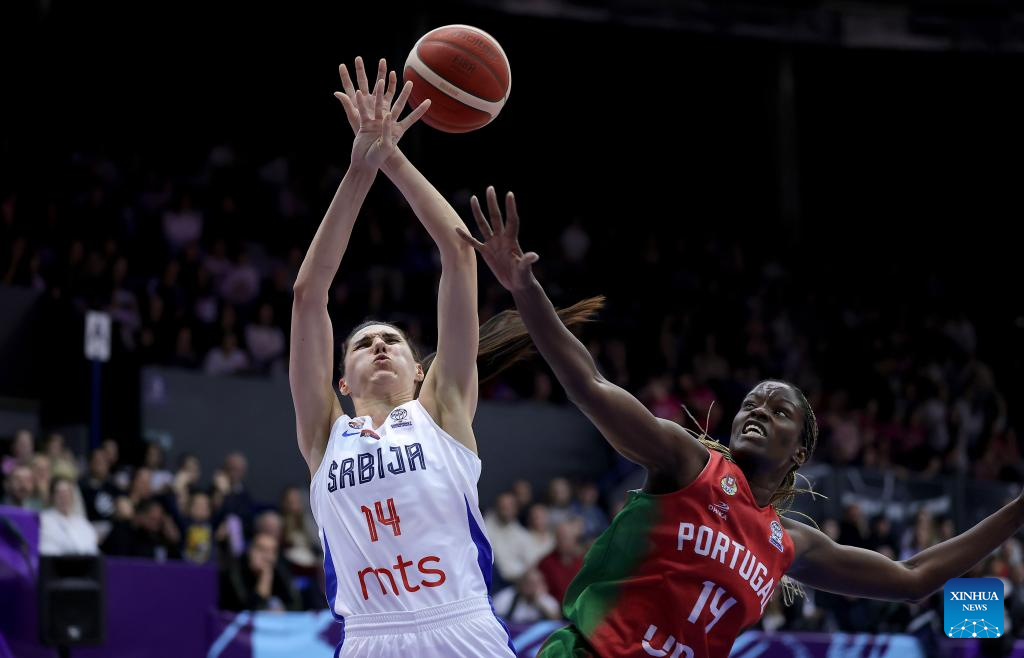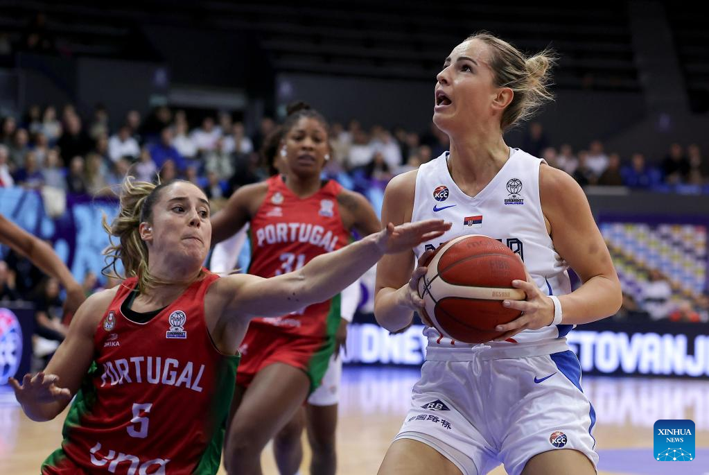 Serbia's Dragana Stankovic (L) vies with Portugal's Sofia da Silva during the FIBA Women's EuroBasket 2027 Qualifiers match between Serbia and Portugal in Belgrade, Serbia, on Nov. 15, 2025. (Photo by Predrag Milosavljevic/Xinhua)