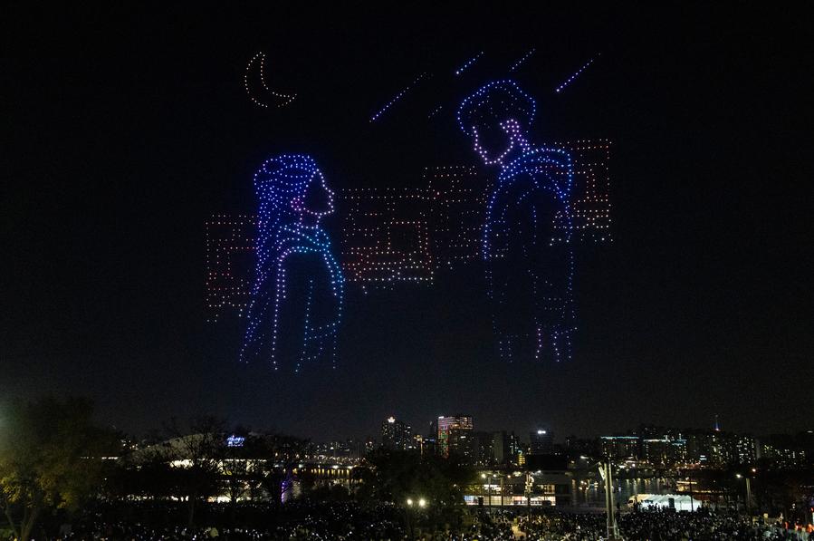 SEOUL, Nov. 16 (Xinhua) -- People enjoyed a drone light show at Han River Park in Seoul, South Korea, marveling at the scenes crafted by the drones that captured strong local colors.