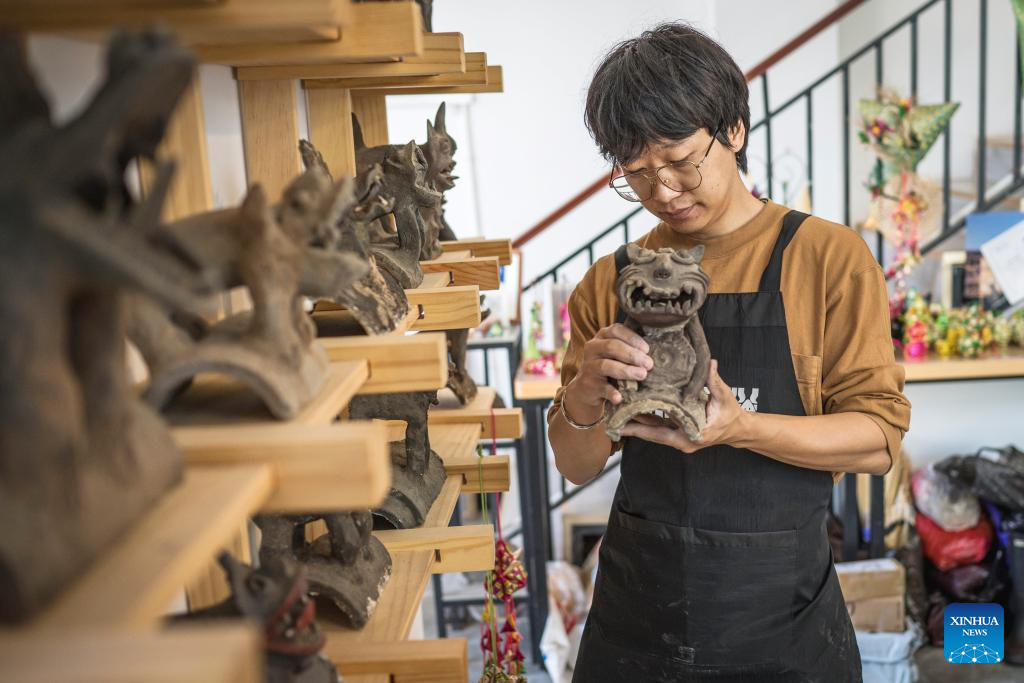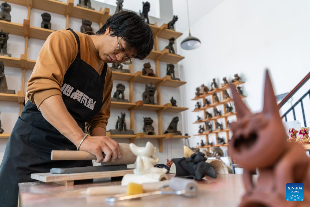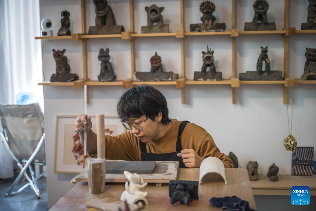 In his studio, Zhang mixes clay, shapes the cat's head and body, and then fires it in a kiln after drying. The belly of the cat is left hollow, with its mouth and tail connected, symbolizing the idea of "swallowing evil and releasing blessings."