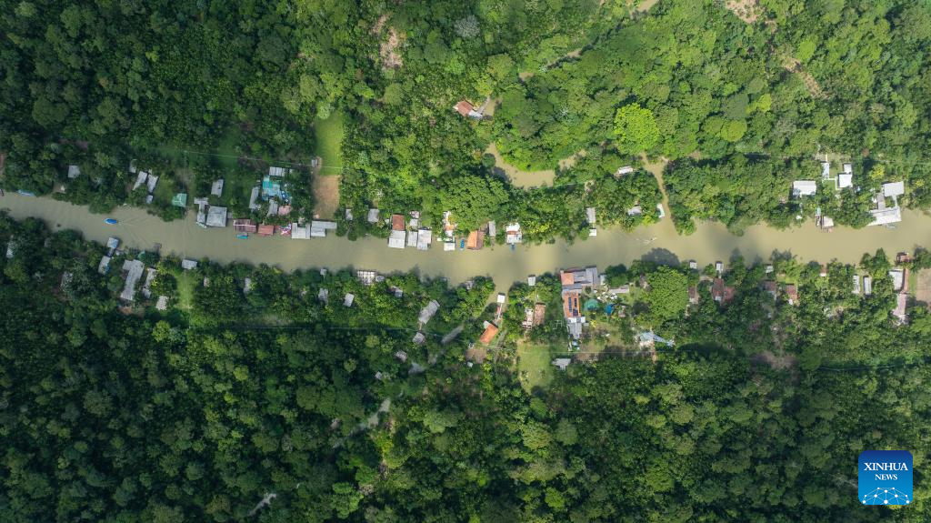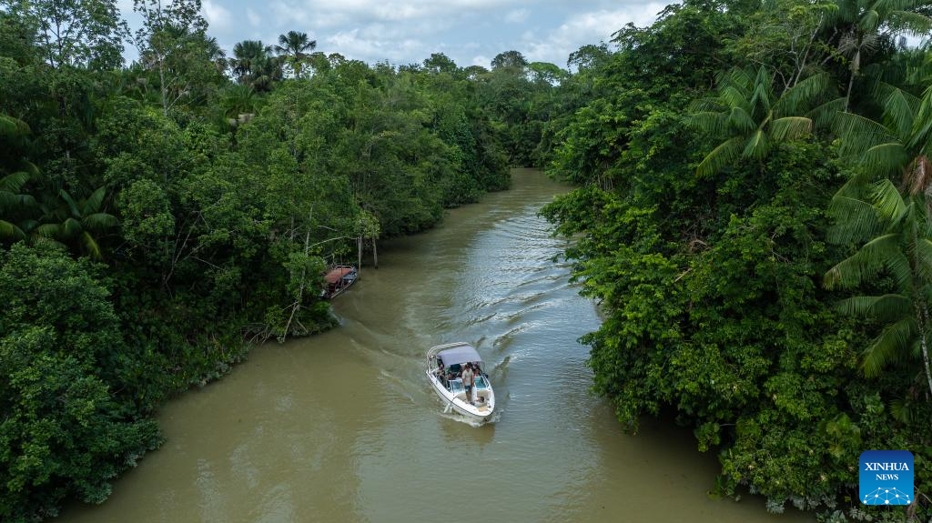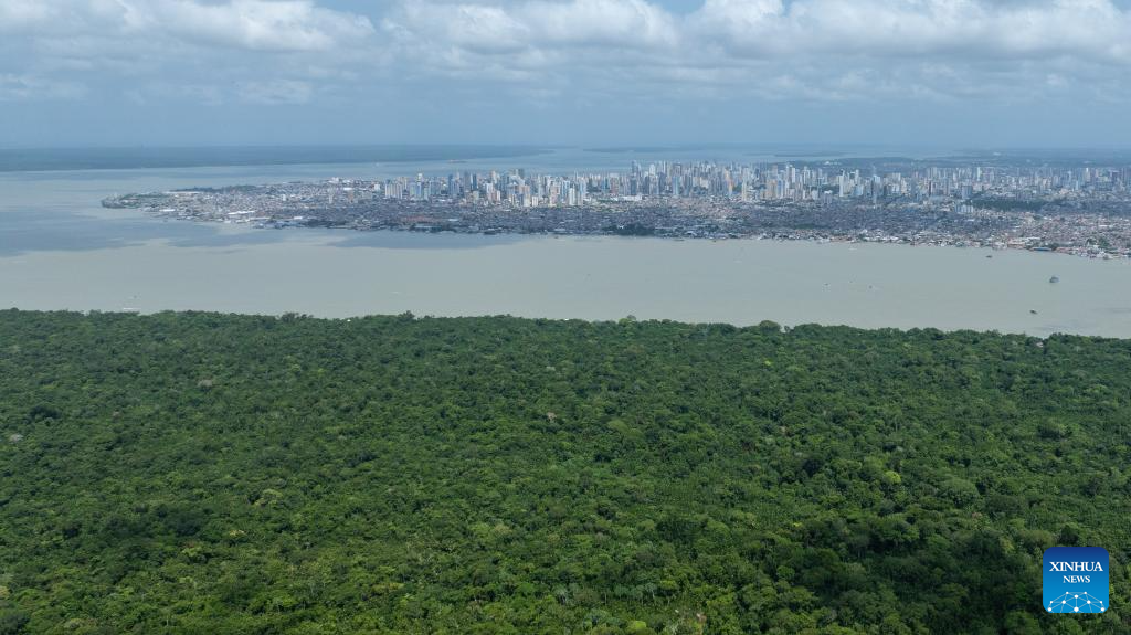 An aerial drone photo taken on Nov. 16, 2025 shows tropical rainforest and waterways in Belem, Brazil. (Xinhua/Wang Tiancong)