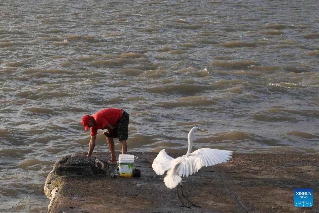 A fisherman works on the riverside as an egret spreads its wings in Belem, Brazil, Nov. 16, 2025. (Photo by Claudia Martini/Xinhua)