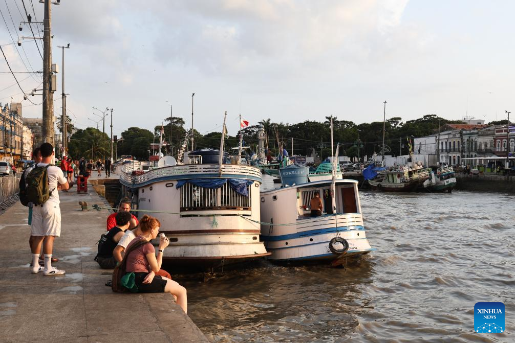 People relax by the riverside in Belem, Brazil, Nov. 16, 2025. (Photo by Claudia Martini/Xinhua)
