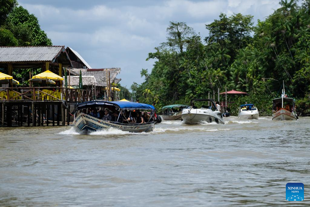 Boats travel along a river channel in Belem, Brazil, Nov. 16, 2025. (Xinhua/Wang Tiancong)