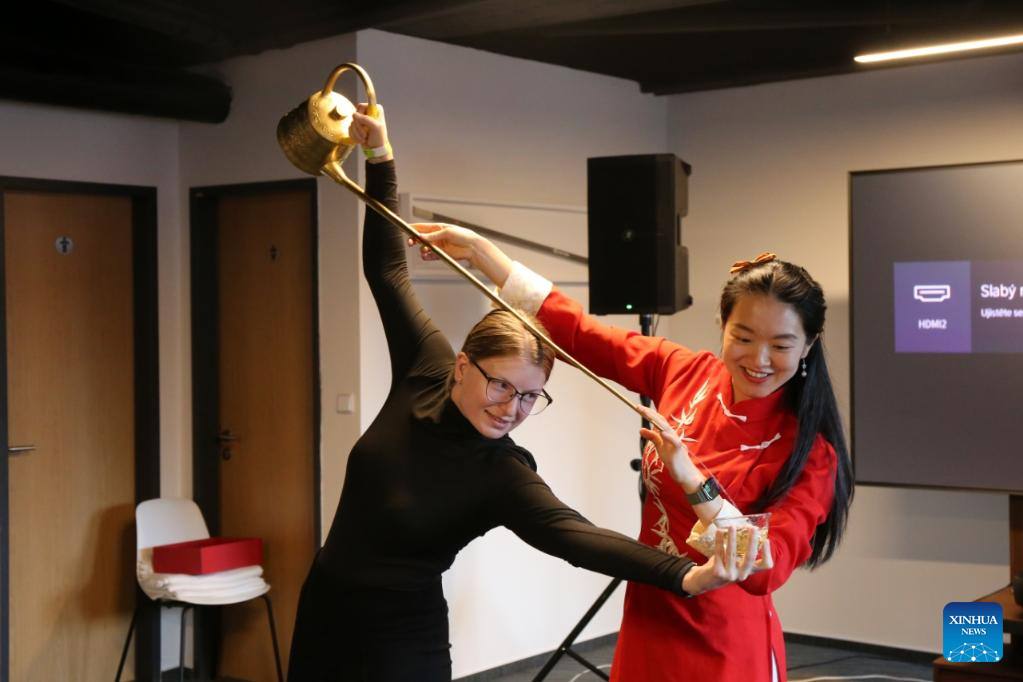 A girl tries Chinese tea ceremony with a long-spout teapot during the 2025 Euro Tea Expo held in Prague, the Czech Republic, Nov. 15, 2025. The 2025 Euro Tea Expo concluded on Sunday in Prague, bringing together tea experts, exhibitors and enthusiasts from around the world, with this year's focus on Chinese Pu'er tea and southwest China's Yunnan Province. During the two-day event, experts from China introduced the history, fermentation techniques and cultural traditions of Pu'er tea through lectures and live tastings. (Photo by Helena Kocova/Xinhua)